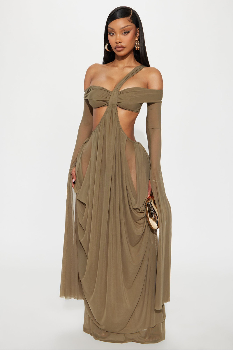 Ця вишукана сукня максі "Алора" вражає своєю елегантністю та сучасним дизайном. Вона має спокусливе декольте "оф-шолдер", довгі рукави та пікантний виріз. Делікатний драпірований та плісирований мереживний текстиль створює неповторний образ. Еластична тканина забезпечує ідеальну посадку по фігурі, підкреслюючи вашу жіночність. Основа: 95% нейлон, 5% спандекс.