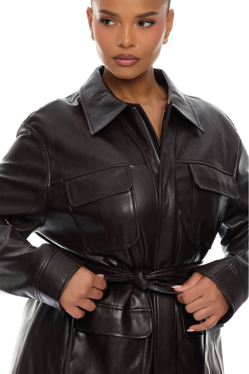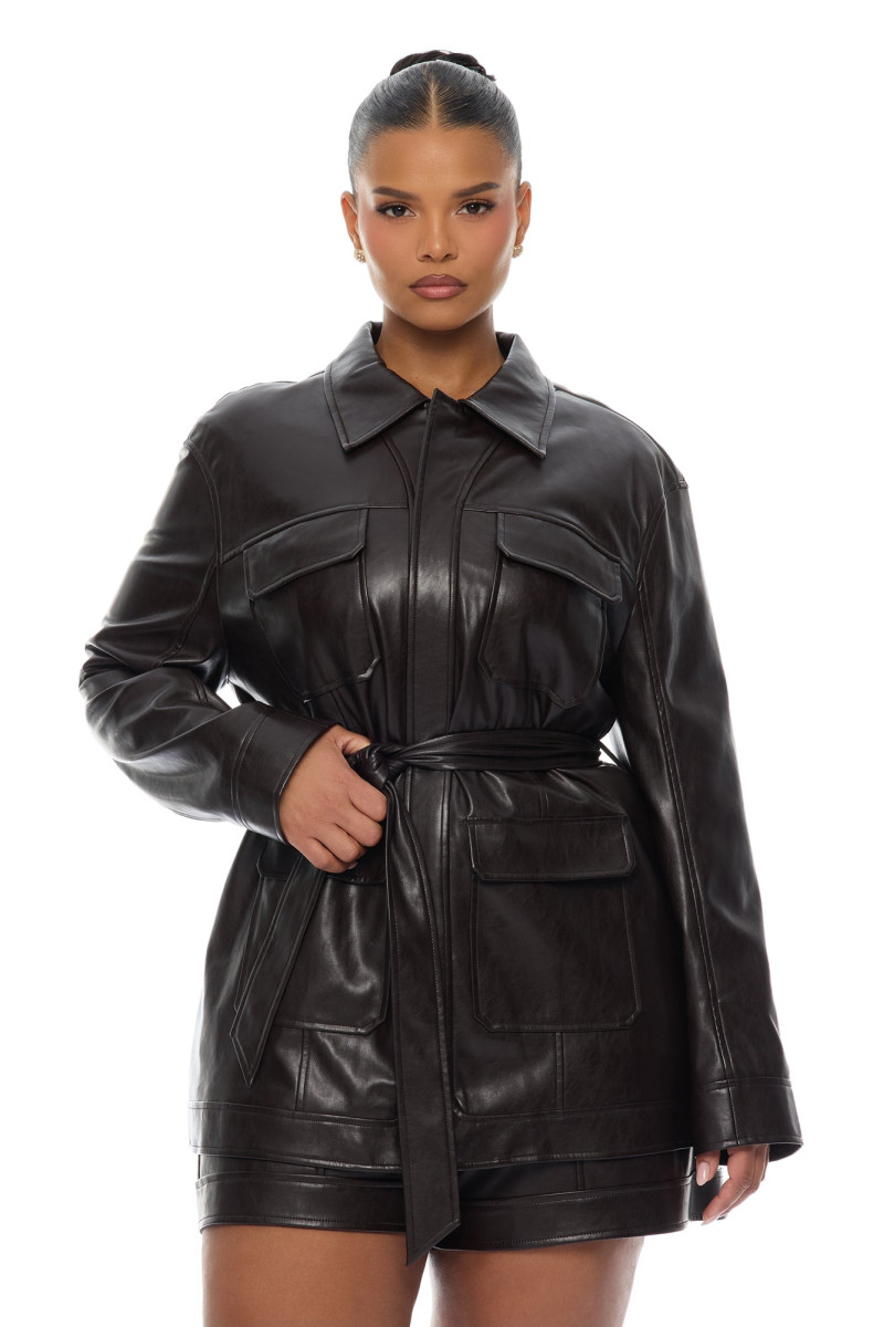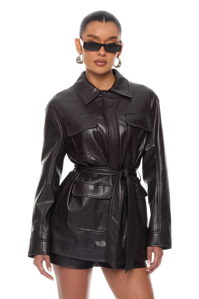 Підкресліть свою фігуру за допомогою стильної куртки 'Zaya' зі штучної шкіри. Елегантний пояс вдало акцентує талію, створюючи жіночний і витончений силует. Виготовлена з м'якої штучної шкіри, ця куртка забезпечує комфорт і бездоганний вигляд. Це універсальний елемент гардеробу, який додасть шику будь-якому образу.