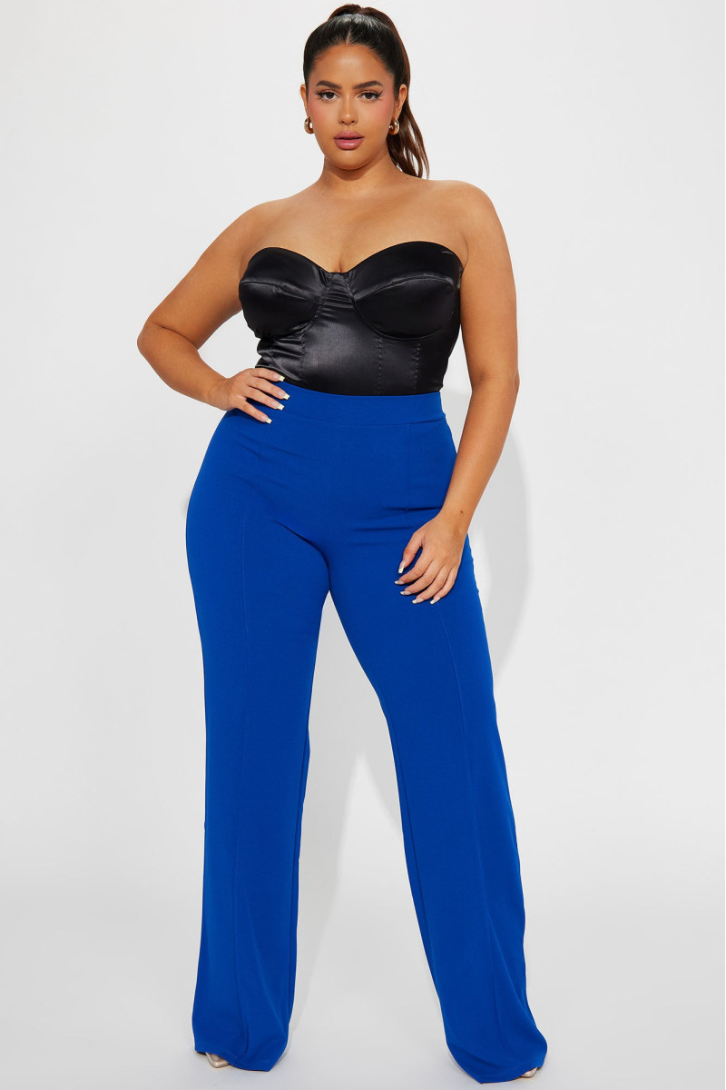Елегантні довгі штани "Вікторія" з високою талією та розширеними штанинами, що створюють вишуканий силует. Довжина 36 дюймів по внутрішньому шву ідеально підходить для високих жінок. Штанні складки додають строгості та витонченості, а еластична тканина забезпечує комфорт протягом усього дня. Застібка на блискавку ззаду. Склад: 95% поліестер, 5% спандекс.